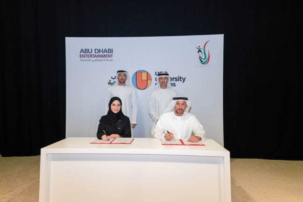 توقيع اتفاقية إطلاق الموسم الأول من الألعاب الجامعية التي ستعقد بشكل سنوي، بين اتحاد الإمارات الرياضي لمؤسسات التعليم المدرسي والجامعي وشركة أبوظبي للترفيه خلال “خلوة مستقبل الرياضة”