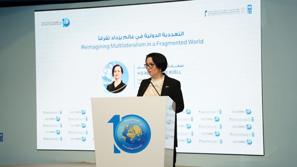 شهد اليوم الأول من فعاليات الدورة العاشرة من “قمة المعرفة” التي تنظمها مؤسسة محمد بن راشد آل مكتوم للمعرفة بالشراكة مع برنامج الأمم المتحدة الإنمائي في مركز دبي التجاري العالمي، جلسةً بعنوان “التعددية الدولية في عالم يزداد تفرقاً” تحدثت خلالها سعادة بيرانجير بويل، المنسقة المقيمة للأمم المتحدة في دولة الإمارات، عن آفاق التعاون في عالم مترابط رغم مظاهر الانقسام، ودور العمل متعدد الأطراف في تحسين حياة الناس وحماية الكوكب، إلى جانب أهمية تعزيز الشراكات الإقليمية والدولية ودور الأمم المتحدة في ترسيخ الحوار وبناء الثقة ودفع العمل الجماعي