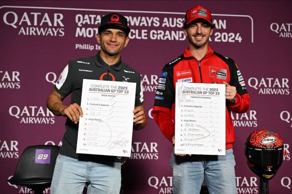 Press Conference 1 saw Championship leader Jorge Martin (Prima Pramac Racing) sit alongside title rival Francesco Bagnaia (Ducati Lenovo Team) before Pedro Acosta (Red Bull GASGAS Tech3) and 2023 winner Johann Zarco (CASTROL Honda LCR) were joined by home hero Jack Miller (Red Bull KTM Factory Racing) for Press Conference 2.