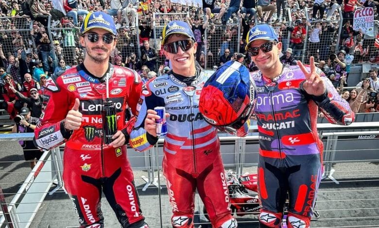 By 16 to go, a small mistake from the Championship leader made it a six-wheeler at the front, the three machines glued together: Martin, Bagnaia and Marquez. Bagnaia wasted no time as he attacked at Turn 3 and made it through, but Martin hit back at Turn 4. That opened the door enough for Marquez to head through too, resetting it to Martin – Marquez – Bagnaia in that order at the front.